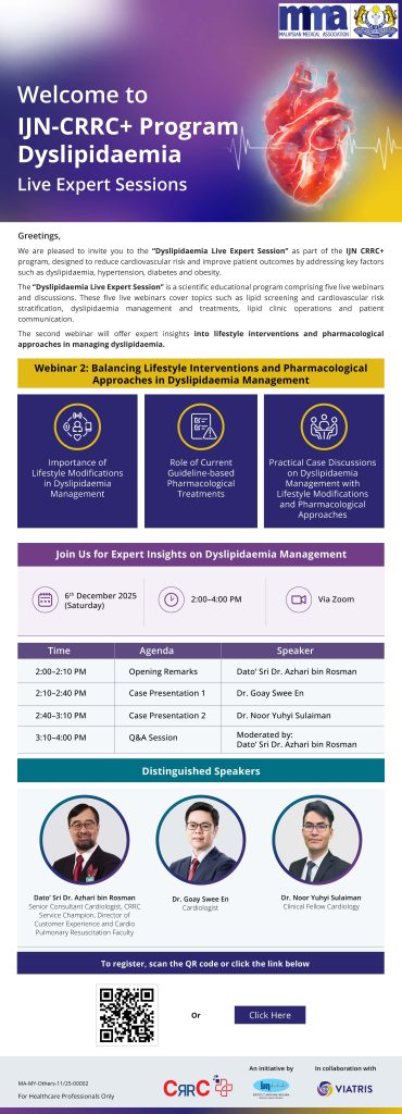 We are pleased to invite you to the “Dyslipidaemia Live Expert Session” as part of the IJN CRRC+ program, designed to reduce cardiovascular risk and improve patient outcomes by addressing key factors such as dyslipidaemia, hypertension, diabetes, and obesity.