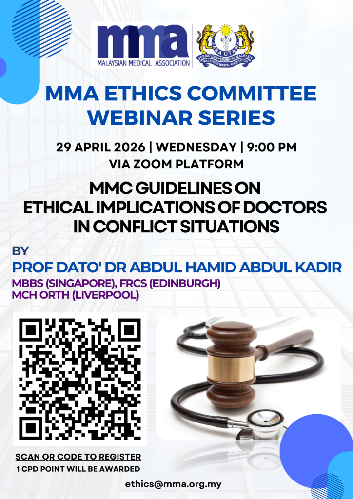 You are cordially invited to join us for the monthly Ethics Webinar Series organised by the MMA Ethics Committee. Our topic this month will be delivered by Prof Dato’ Dr Abdul Hamid Abdul Kadir. The details are as follows: