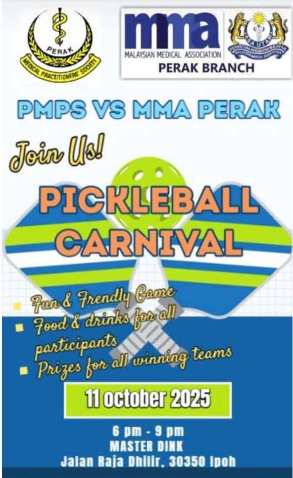 MMA Perak, together with the Perak Medical Practitioners Society (PMPS), is delighted to invite you to our upcoming Pickle Ball Carnival. It will be an enjoyable evening of fun, fellowship, and some friendly competition!
