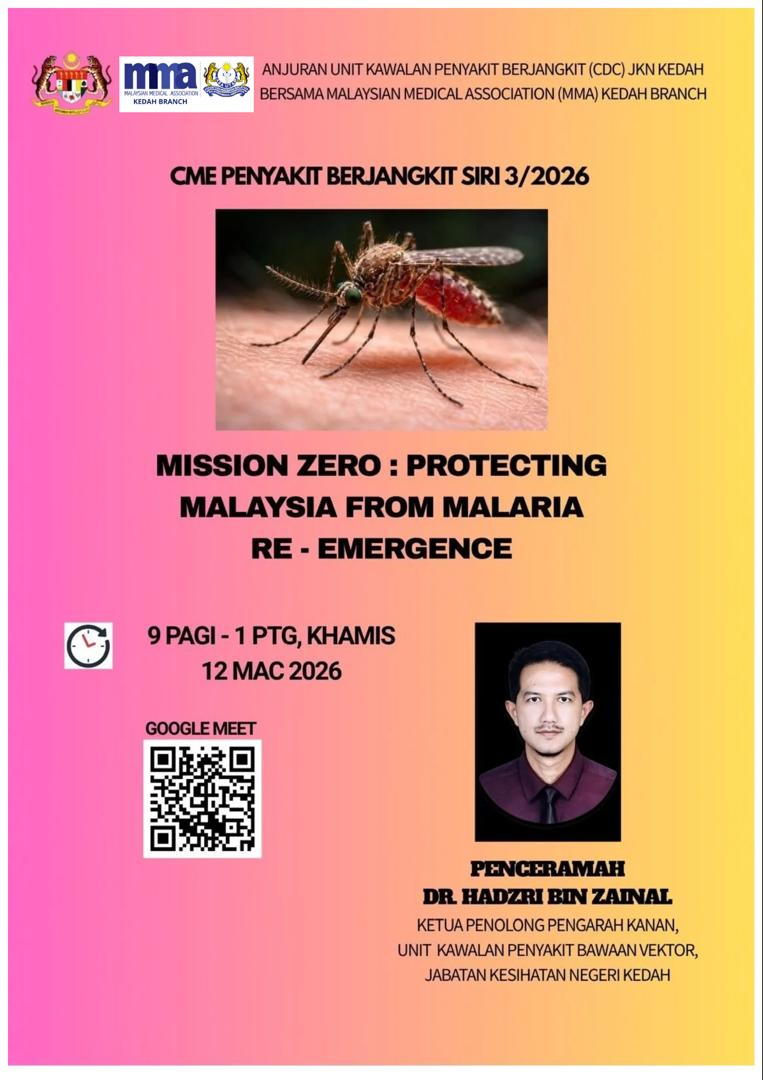 You are cordially invited to participate in the Infectious Disease CME Series 3/2026, organised by the Infectious Disease Control Unit and Vector-Borne Disease Control Unit, Kedah State Health Department, in collaboration with the Malaysian Medical Association (MMA) Kedah Branch.