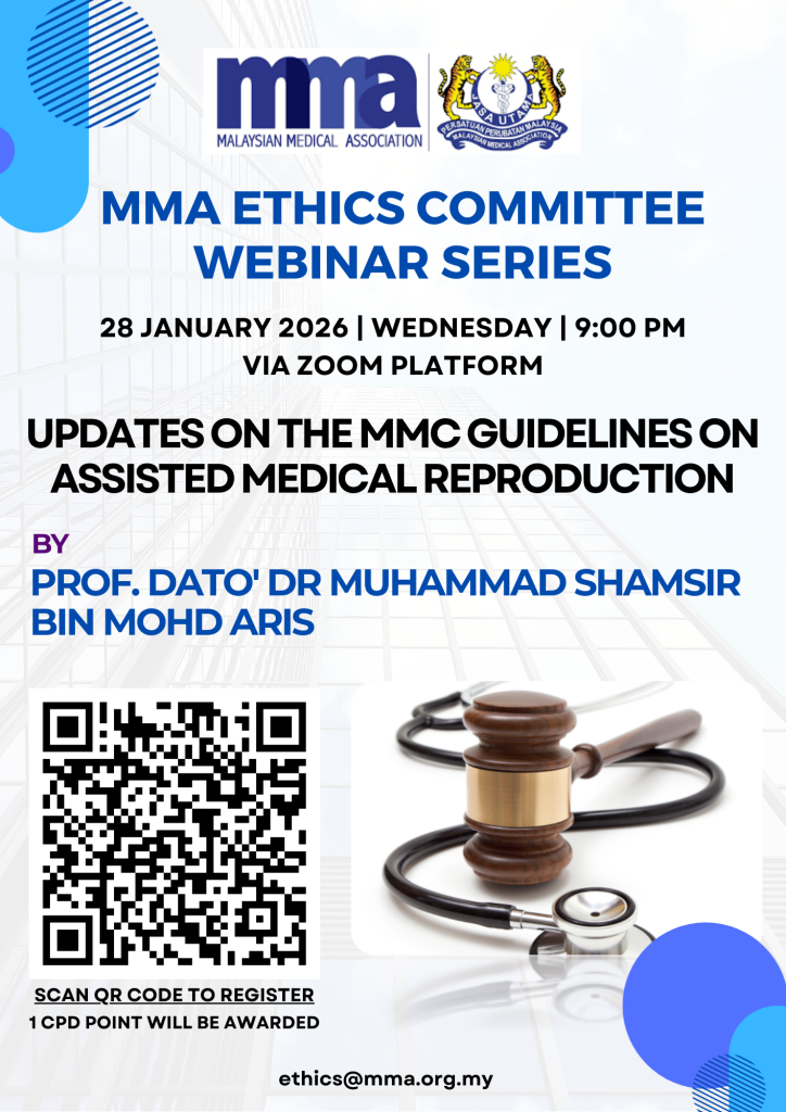 You are cordially invited to join us for the monthly Ethics Webinar Series organised by the MMA Ethics Committee. Our topic this month will be delivered by Prof. Dato’ Dr. Muhammad Shamsir Bin Mohd Aris. The details are as follows: